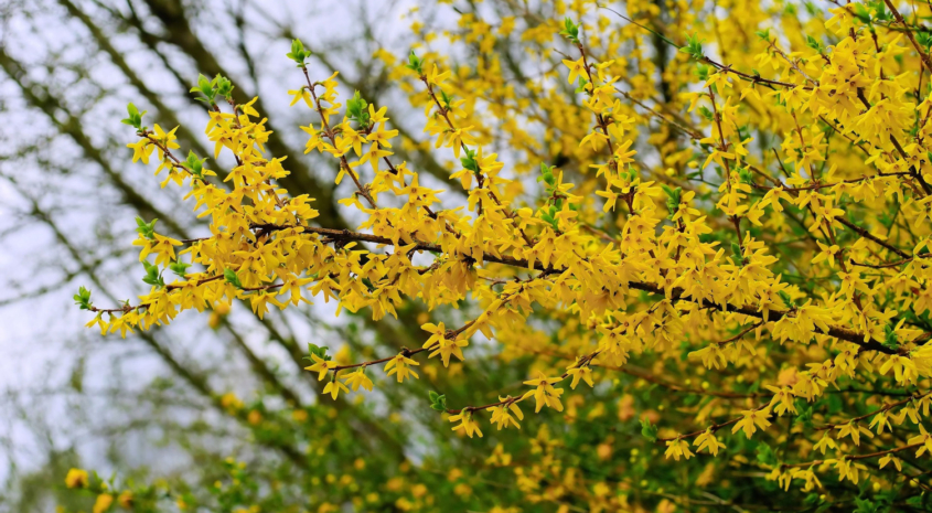 Le forsythia, plante indicatrice du début de la croissance du gazon.